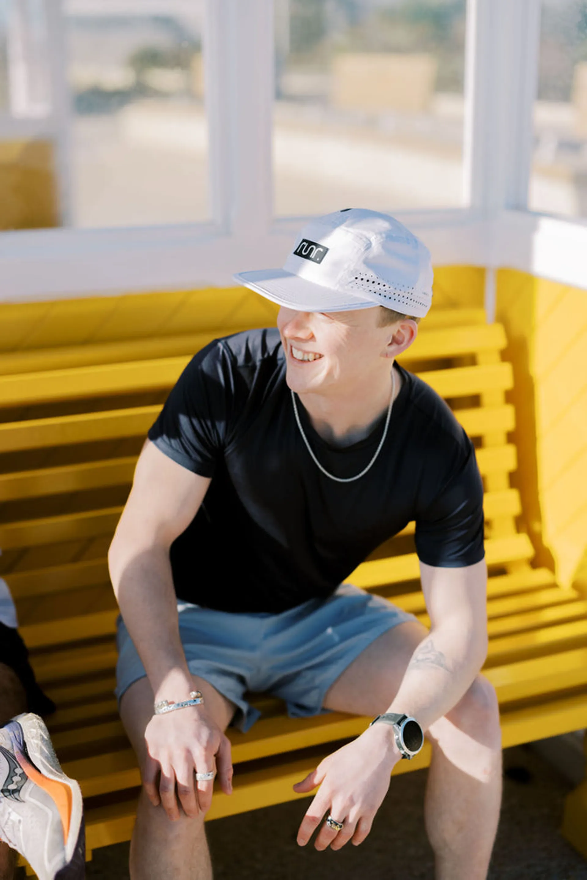 Crafted from ultra-light, moisture-wicking fabric, it keeps you cool on the hottest runs, while laser-cut side ventilation boosts breathability where it matters most. The structured five-panel design offers a snug, bounce-free fit, and the flat brim gives you sun coverage without compromise.